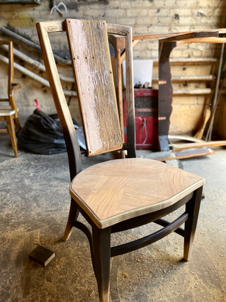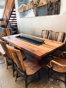 This commission features a large patio table made from reclaimed pine. The set includes a custom-made steel insert with a lid for cool beverages or decorative elements. Six repurposed chairs and a custom bench were included in the build.