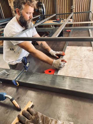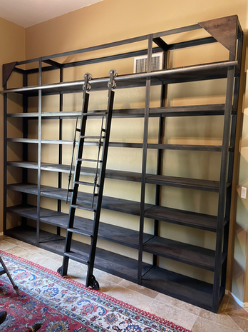 Our client wanted a tall custom library system for their living area with a rolling ladder. We built a steel base and used Chinkapin oak for the wooden shelves, which we finished in a dark stain to match the rest of their home. The ladder rolls across the unit to access all levels.