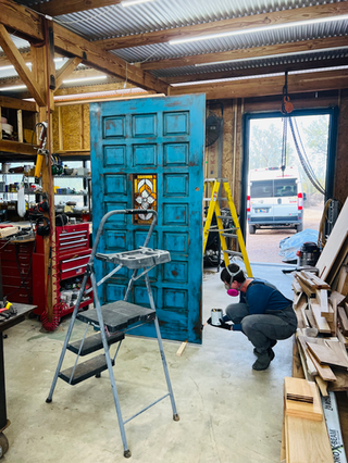 The Cork Tucson wanted to refresh both sides of their front door by adding a touch of Santa Fe-inspired design and a custom cleaver to honor the restaurant's longstanding history on the east side of Tucson, AZ. We took their original hardwood door and faux-finished it with the perfect shade of turquoise. We then built two Southwestern-style emblems from reclaimed barn wood. Two custom cleavers, made from ebony, were mounted on top of the emblems.